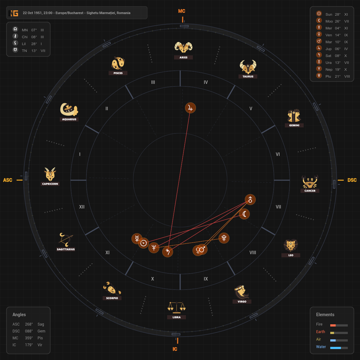 Moon opposition Saturn and Mercury square Saturn point to an inner critic, emotional withholding, or the habit of earning love through usefulness. Sun square Neptune can produce confusion about identity, savior tendencies, or disappointment when ideals meet reality. Mars opposition Pluto suggests shadow themes around control, anger, and intensity—learning to use power consciously rather than reactively. Lilith contacts (Moon square Lilith; Mercury conjunct Lilith) indicate taboo truth-telling and a need to integrate instinct without self-sabotage.