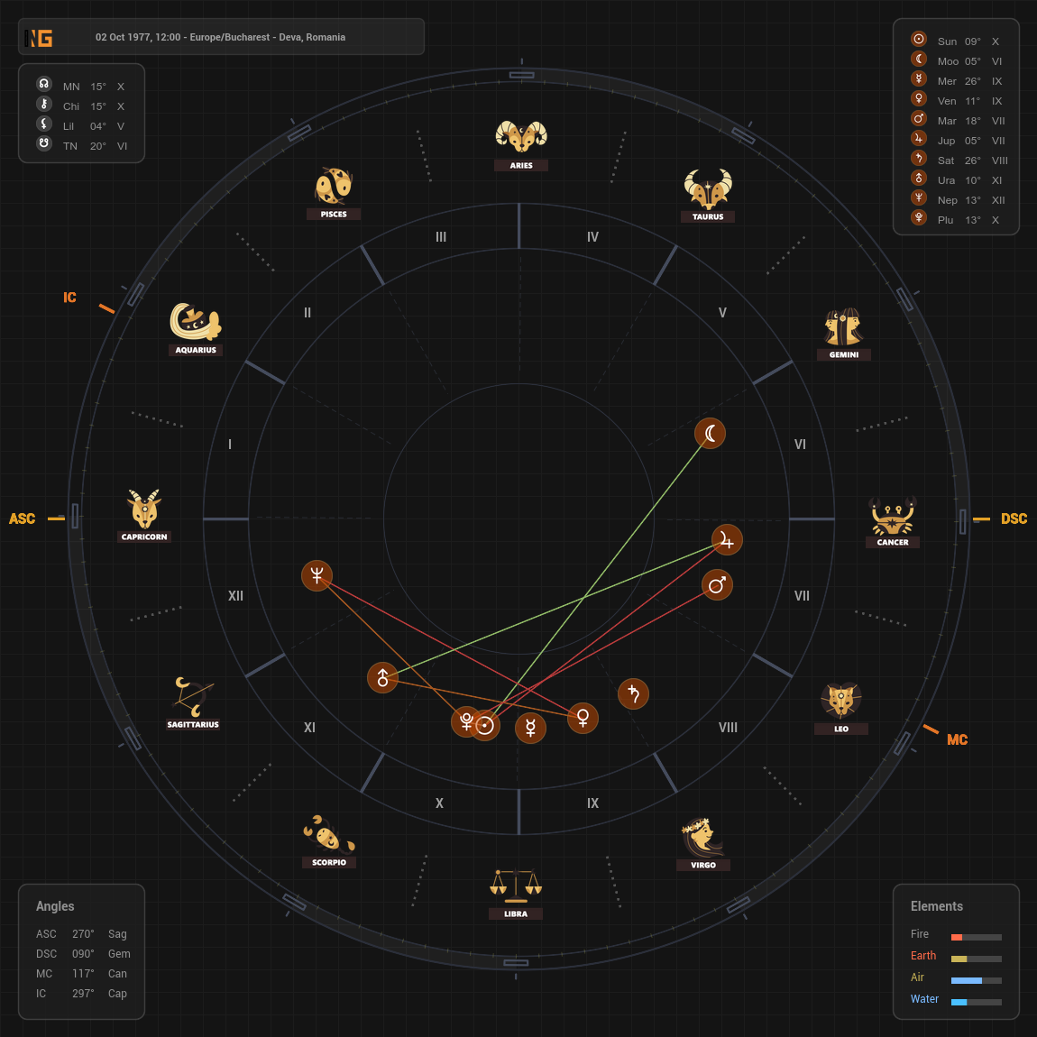 Mean Node in Libra in the 10th, tightly conjunct Chiron and close to Pluto and the Sun, emphasizes a destiny around visible contribution: learning balanced leadership, ethical authority, and relational intelligence in public life. The North Node (True Node) in Gemini in the 6th (as given) highlights an additional developmental thread: mastering communication, adaptability, and skill-building through daily work and service. The chart’s bucket shape suggests a focused life mission: energy concentrates around career/relationship/service themes rather than spreading evenly. Western hemisphere emphasis indicates that key turns often arrive through other people—mentors, partners, rivals, clients—who act as mirrors guiding you toward your rightful role.