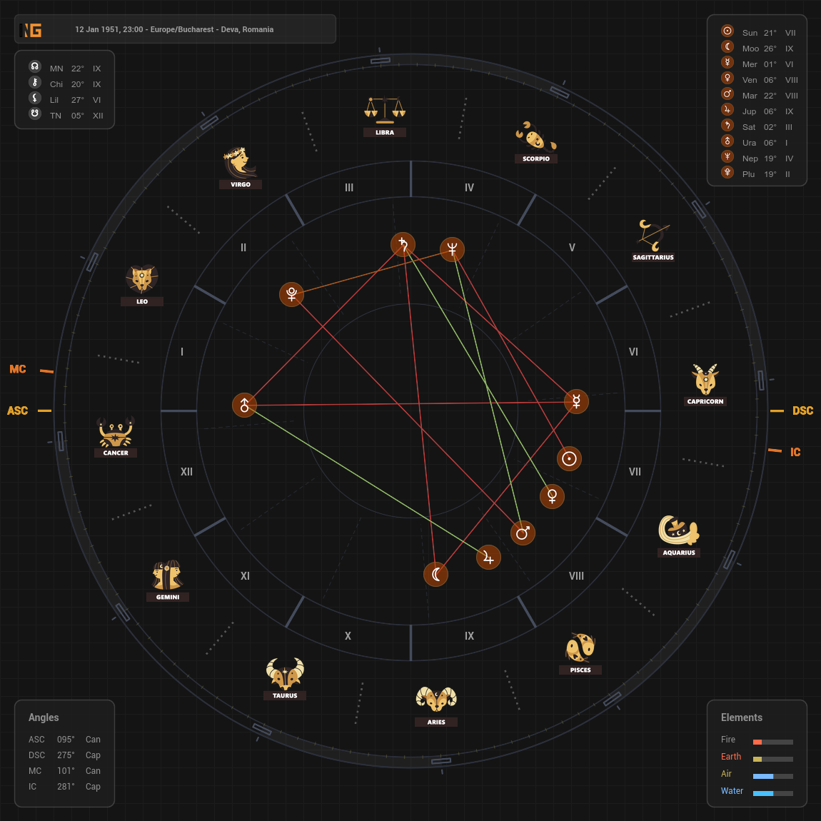 Cancer rising gives a protective, receptive temperament, while Uranus retrograde in the 1st house adds an unmistakable uniqueness—an independent streak beneath a careful exterior. Capricorn Sun with Mercury in Capricorn supports conscientiousness, strategy, and a preference for competence and integrity. High air and water blend intellect with empathy: you can reason and feel simultaneously, though Moon–Mercury tension shows the need to integrate them consciously. Venus dominant (highest score) makes you relationally intelligent and value-driven; Neptune dominant adds sensitivity, imagination, and an idealistic moral compass. Mars in the 8th supplies courage for psychological depth, while Saturn’s low dominance yet strong aspects indicate that self-judgment and restraint may be louder internally than externally.